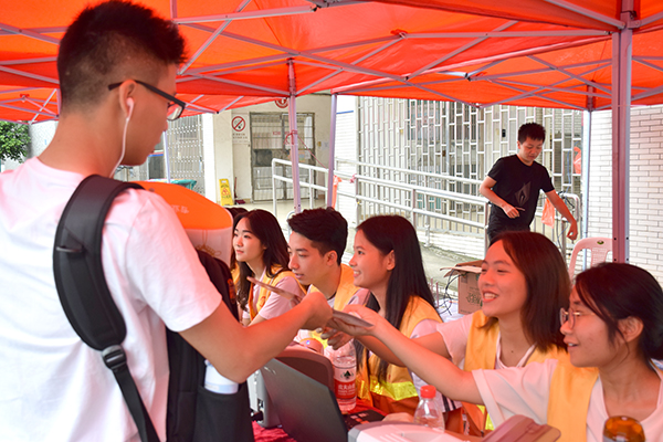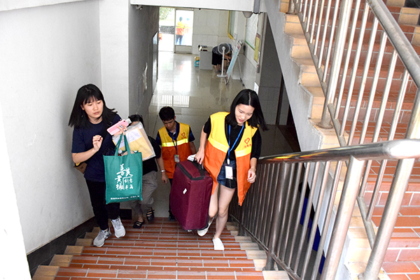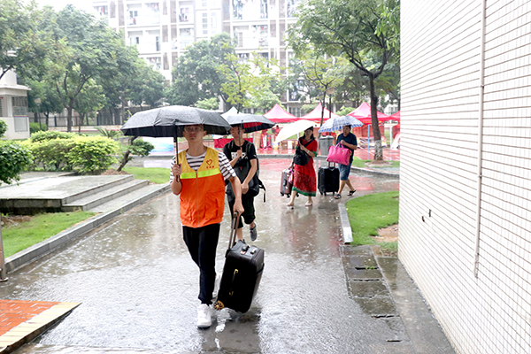 新生的初来乍到,总少不了老生的暖心陪伴。从校外新生接待站、校内公共服务点到新生入住的各个公寓区……到处都活跃着身穿橙色制服的志愿者们。他们始终主动、细致、耐心地引导新生报到,帮助新生搬运行李,完成扫码注册、办理宿舍入住等手续,为新生、家长提供了各种力所能及的帮助。9月8日雨势很大,但志愿者们仍坚守在迎新的第一线,及时出现在新生报到需要帮助的每一处,成为风雨中一道亮丽的风景线。15级工程力学专业的王旭同学从大二开始已经连续参与了三年的迎新志愿服务工作,“感觉每一年都很有收获,为新生服务,帮助他们解决问题是我们学长应该做的”。“北站一天有三班志愿者,从新生抵达车站到专车接送再到入校报到,志愿者们全程陪伴在他们左右”, 机汽学院壹心协会副会长甘锦裕同学觉得迎新志愿者的工作并没有想象中的轻松简单,不过虽然繁忙劳累,但是只要学弟学妹们能够顺利报到,一切都是值得的。