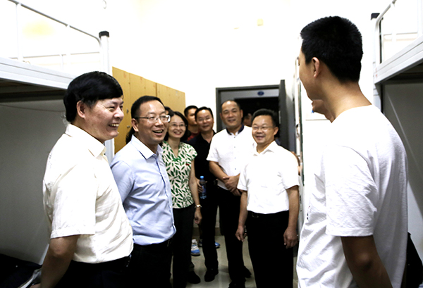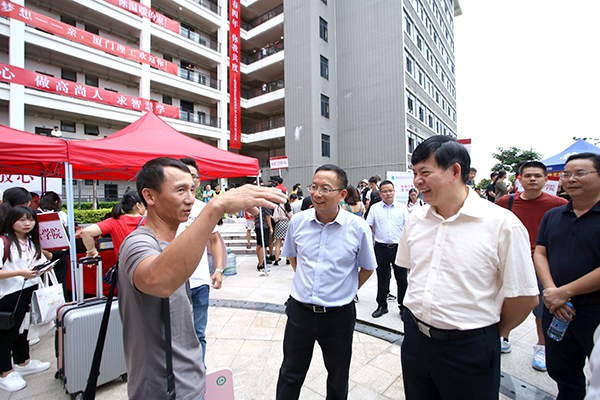 学校高度重视新生报到工作,研究制订《2018年迎新工作方案》,并召开迎新工作会进行专题部署。根据学校的统一部署,全校各单位精心组织、周密准备、协同配合,确保迎新各项工作顺利有序开展。9月9日上午,朱文章校长、校党委林志成副书记、尤国顺副校长、陈丽安校长助理带领相关职能部门负责人,走访了集美校区、厦软校区各迎新服务点,以及思明苑、知行苑、集美苑等新生宿舍区,检查了解迎新工作,对各单位为迎新所做的辛勤工作表示肯定,向迎新工作人员、志愿者们表示慰问。在新生宿舍,校领导与新生和家长亲切交谈,关切询问他们来校报到的情况。“一切顺利”、“来学校就像回家”,家长们高兴地表示,学校安排很周到,服务很贴心。朱文章校长勉励新生们“爱校如家”,享受美丽的校园环境以及良好的学习生活氛围,发奋读书,学有所成。在集美苑,朱校长一行还参观了学习之家和活动之家,要求有关部门进一步完善设施,做好管理工作,为宿舍区的学生提供更加便利的学习和生活环境。
