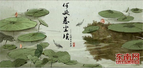 《何处惹尘埃》动画采用了传统的手绘方式来展示,动画风格属于古风;画面是宁静致远的山林,烟雾缭绕的青山,温和的阳光洒在清澈的湖面上,映日荷花,绿叶碧波,寺庙里香炉的薄烟缓缓升起。指导老师杨东表示,《何处惹尘埃》是一部纯二维手绘动画,题材源于传统佛教典故,共花费了一年多的时间,剧本被pass掉10几个,最后选定以闽南南普陀背景为原型进行佛教故事的创作,团队前期专门到寺庙访问法师,考察寺庙的场景环境,制作过程非常辛苦。
